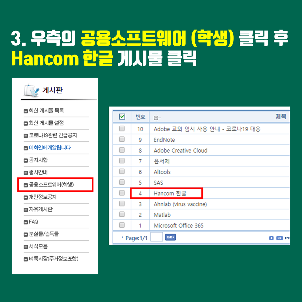 Hancom 한글 다운로드 방법BUT2020년 4월 9일1분 분량#한글 #한컴 #한글다운로드 #한컴다운로드아직도 한글을 다운 받지 못한 벗이 혹시 있나요?그렇다면 다음과 같은 절차를 통해 다운 받으세요!--------------------------------> 유레카 바로가기http://eportal.ewha.ac.kr/ep/page/index.do?pageId=N201104261501344241246
